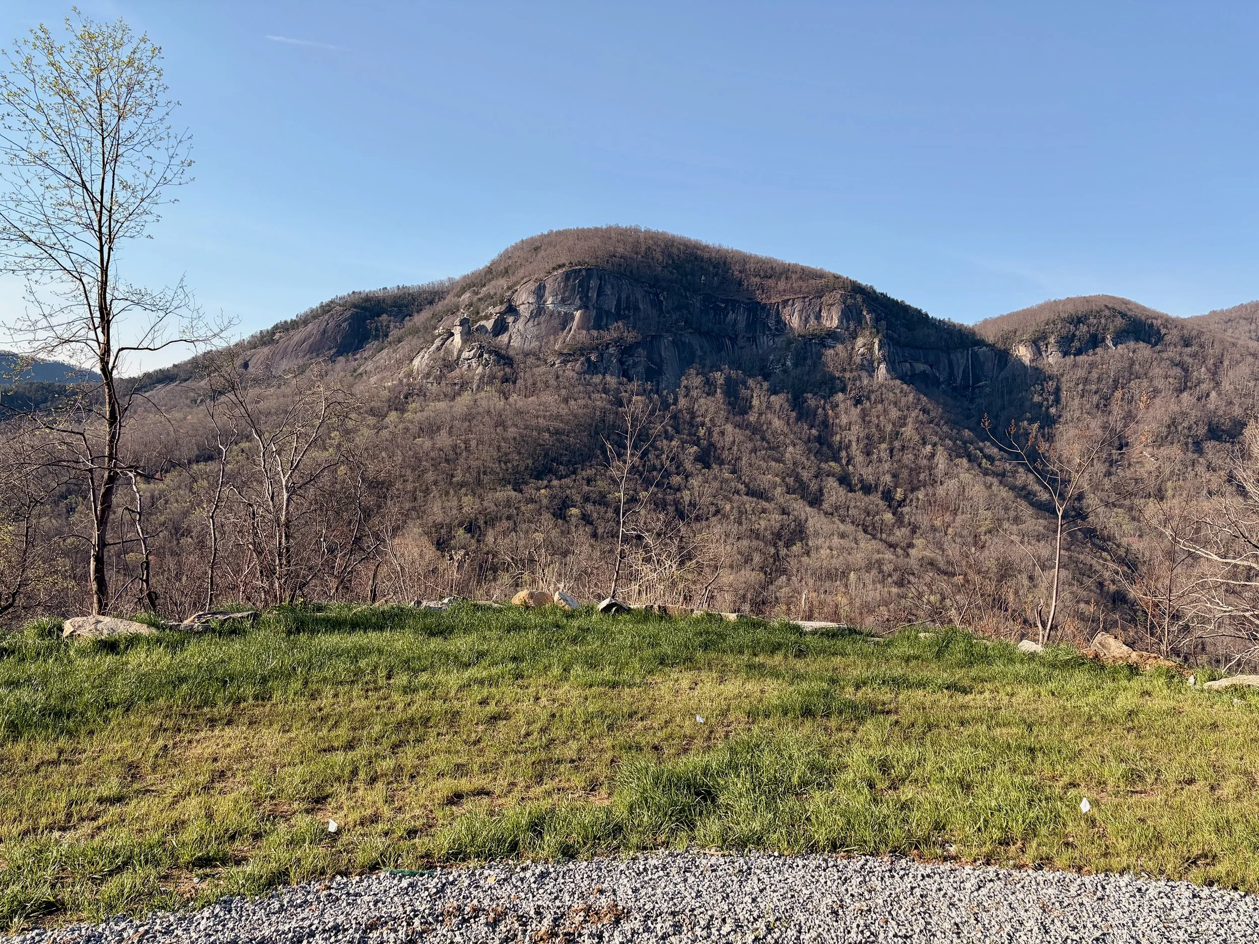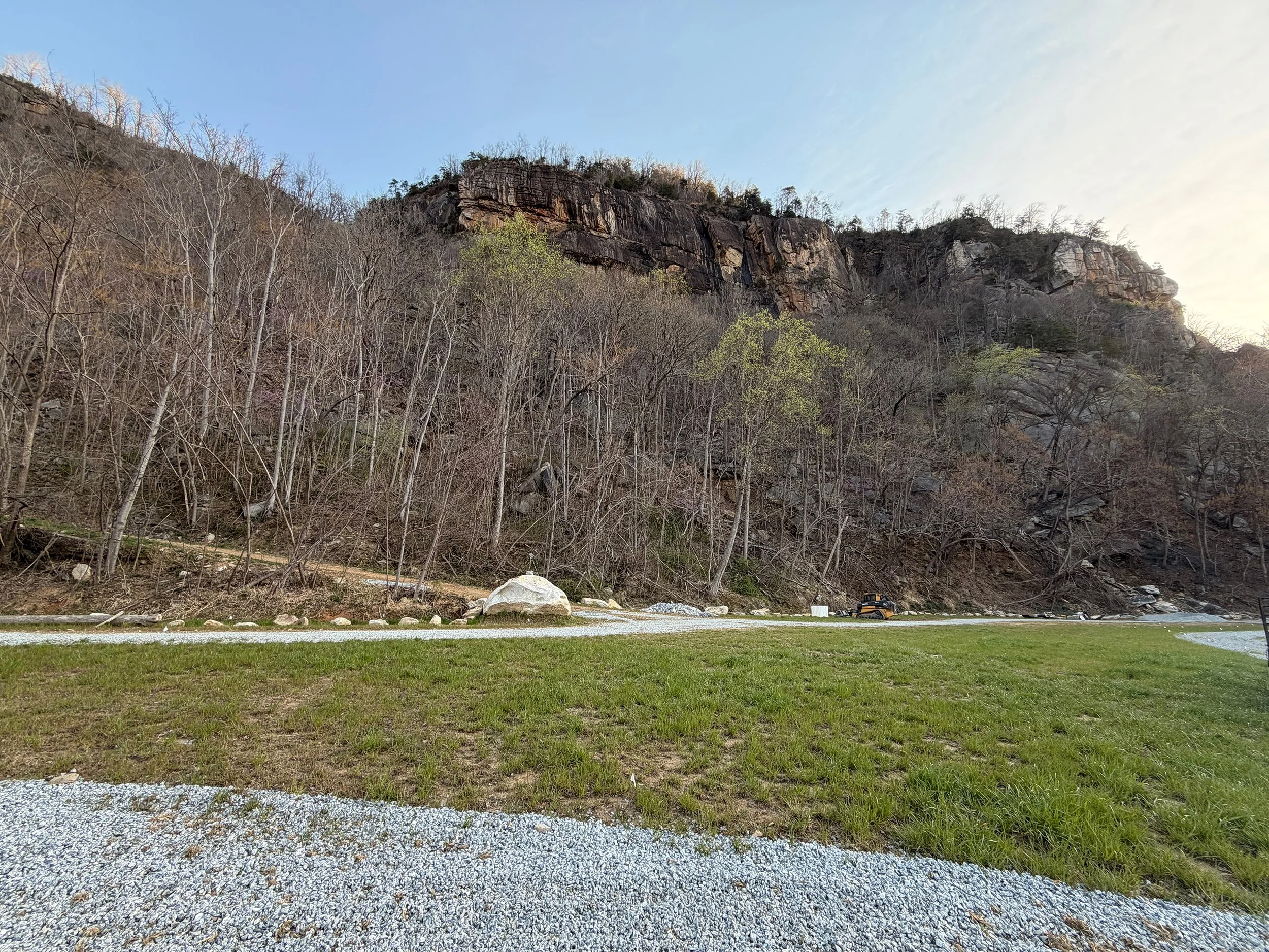 Located in the middle or back of the meadow along the creek and high above downtown Chimney Rock, these pet-friendly sites have obstructed views of Chimney Rock State Park, the 300ft Hickory Nut Gap Falls, the Rocky Broad River and valley below. Enough space for up to a class B camper van (22ft), each standard primitive camp site is 25’ x 15’. AWD/4WD vehicles encouraged. Expect no water or electricity at your site and a short walk to the porta-potty with sink. Bring anything you’ll need in and out. There is a communal fire-pit for all to enjoy.